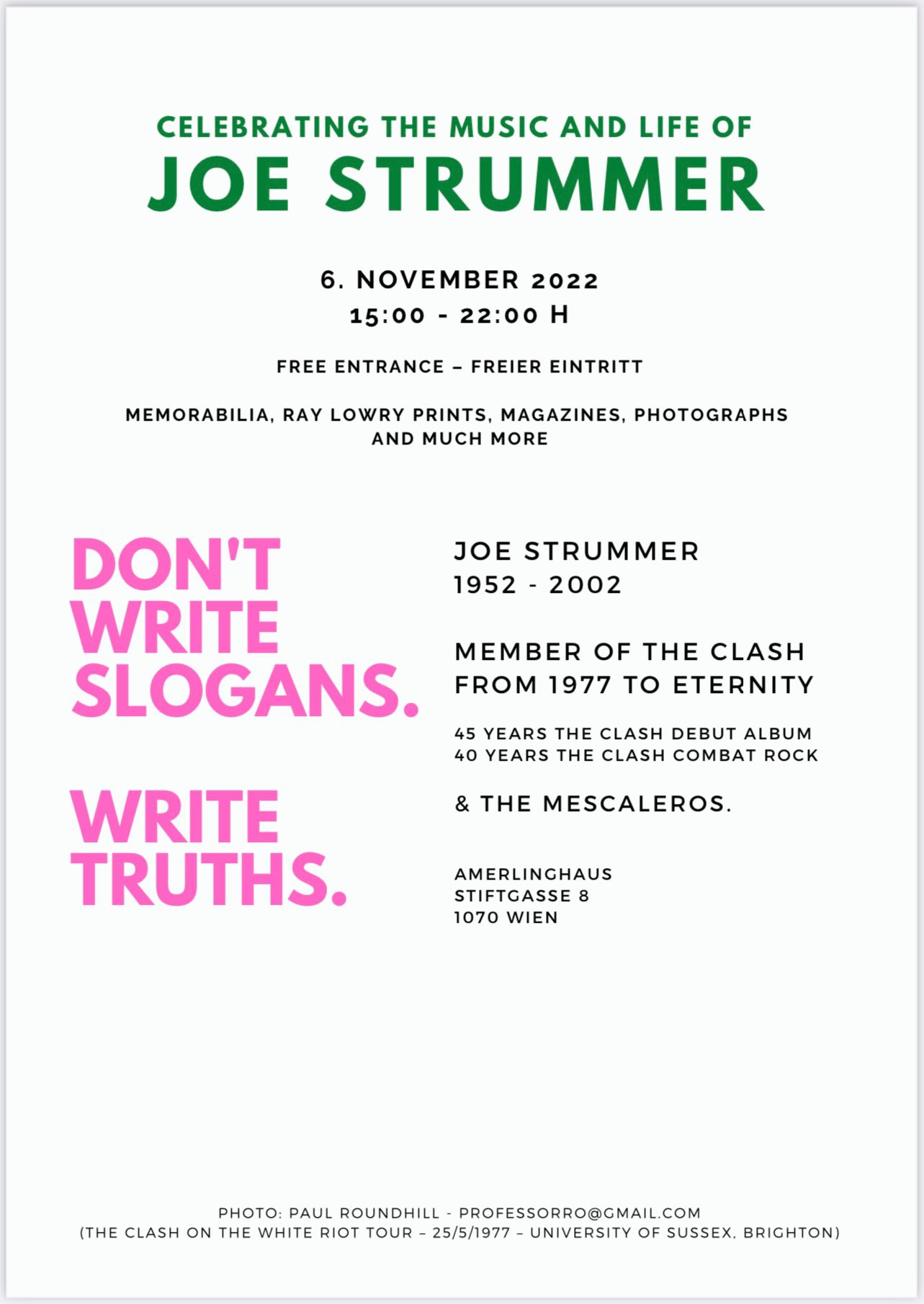 Rock and RollA celebration of the life and work of Joe Strummer 6/11/2022 Vienna 20 year anniversary of the death of Joe Strummer who dedicated his life and career to justice for all Paul and Mick at Kosmo’s art show Share this: Click to email a link to a friend (Opens in new window) Email More Click to share on WhatsApp (Opens in new window) WhatsApp Click to share on Pinterest (Opens in new window) Pinterest Click to share on X (Opens in new window) X Click to share on Reddit (Opens in new window) Reddit Click to share on Pocket (Opens in new window) Pocket Click to share on Facebook (Opens in new window) Facebook Click to share on Telegram (Opens in new window) Telegram Click to share on LinkedIn (Opens in new window) LinkedIn Click to share on Tumblr (Opens in new window) Tumblr Like Loading... Related Standard